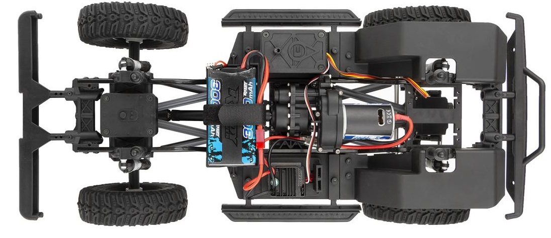 Зчеплення забезпечується комплектом коліс Steelie beadlock розміром 1,9" і шин PinSeekerTM розміром 1,9" x 4,75 дюйма. Ці шини з агресивним малюнком протектора ідеально підходять для скелелазіння та багнистої місцевості.