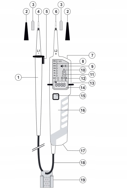 4 Діапазон поляризації (світлодіод) <небезпечна напруга (> 38 В/зміна,> 120 В/постійний струм (ця функція також працює у випадку порожніх акумуляторів або їх відсутності). Фазовий дисплей під час однієї перевірки фази 11 Відображення Rx до випробування безперервності 12 Відображення поля, що обертається, <Лі). 13 Площа зчеплення 14 РК -дисплей для відображення номінальної напруги та символу заміни акумулятора 15 кнопок для ввімкнення ручки L2 (+)