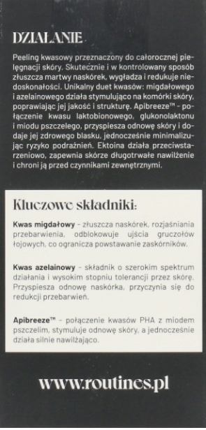 - мигдальна кислота - відлущує епідерміс, висвітлює знебарвлення, розблокує гирло сальних залоз, що обмежує утворення снарядів. Інгредієнт із широким спектром дії та високою ступенем толерантності до шкіри. Прискорює поновлення епідермісу, сприяє зменшенню знебарвлення.