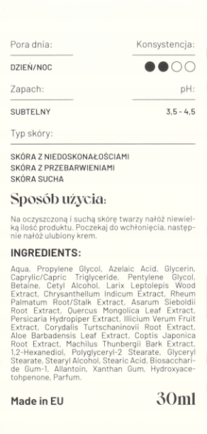 сироватка обличчя на день і ніч, рекомендується спеціально для сухої шкіри, з недосконалостями та знебарвленням. Він також буде працювати в догляді за чутливою шкірою. Може використовуватися протягом року (не сенсибілізує шкіру до сонячного світла).