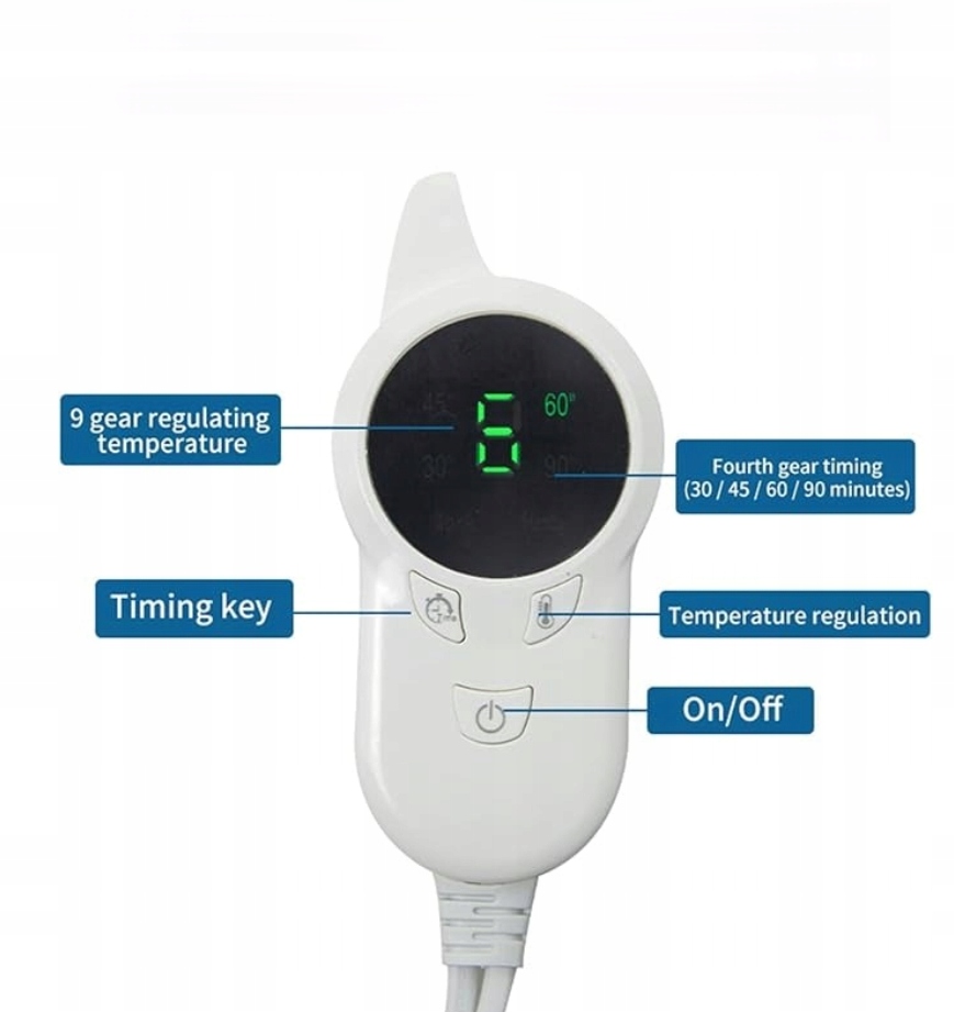 функція автоматичного вимикання . Функція таймера забезпечує 4-годинне автоматичне вимикання в діапазоні від 30 до 90 хвилин. Функція таймера заважає вам забути вимкнути, коли час закінчиться, пристрій вимкнеться автоматично, забезпечуючи безпечний сон. Економить енергію і запобігає опікам, спричиненим надмірним нагріванням, що дуже безпечно.