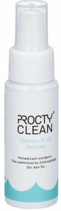 Олія ProctyClean® з вітаміном Е живить і захищає очищений анальний канал під час і після очищення. Він гарантує м’який процес очищення та був спеціально розроблений для проблем анального каналу, таких як геморой, анальні тріщини та анальний свербіж. Поліпшення самопочуття вже після кількох застосувань. Альтернатива мазям від геморою, супозиторіям, трафаретам, вологому туалетному паперу та багатьом іншим. Отримано з цінних інгредієнтів, таких як соняшникова олія, висока доза вітаміну Е, азулен, бісаболол і ромашка. Розроблено і рекомендовано лікарями. 100% зроблено в Німеччині