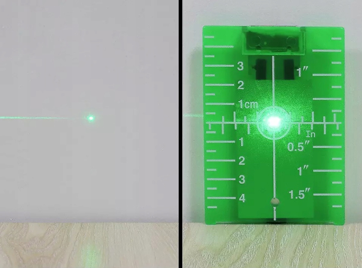 Приціли для лазера зеленого хреста. Це суттєво збільшує видимість лазерного променя, що забезпечує правильне читання під час проведення вимірювань. Оснащений сантиметром і в дюймах, що забезпечує максимальну точність. Додатковий, сильний магніт і складна нога дозволяють легко підвісити щит або його кріплення до металевої поверхні (наприклад, профіль).