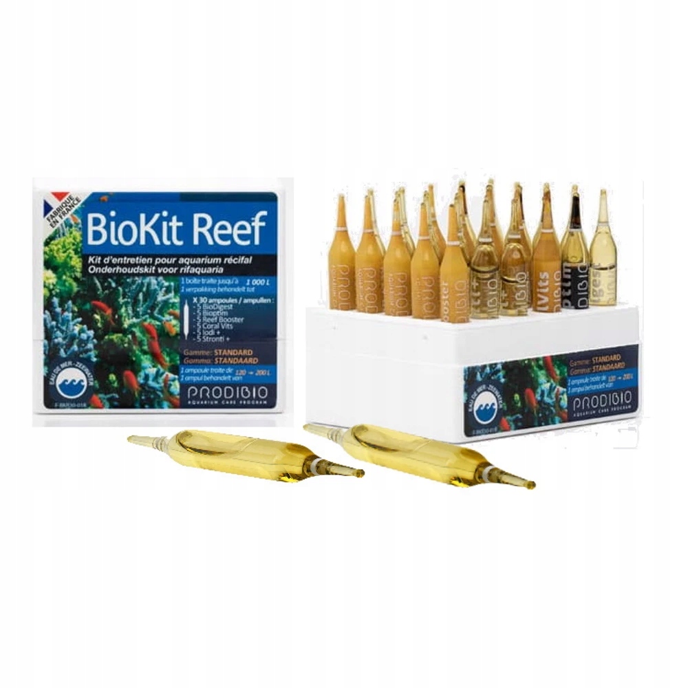 Prodibio BioKit Reef Nano — це набір, який полегшує керування морським акваріумом. Адаптований до потреб рифових нанотанків. У набір входять ампули Prodibio: Biodigest Nano, Bioptim Nano, Reef Booster Nano, Iodi+ Nano та Stronti+ Nano. В упаковці 5 різних препаратів в ампулах по 6 штук кожного виду.