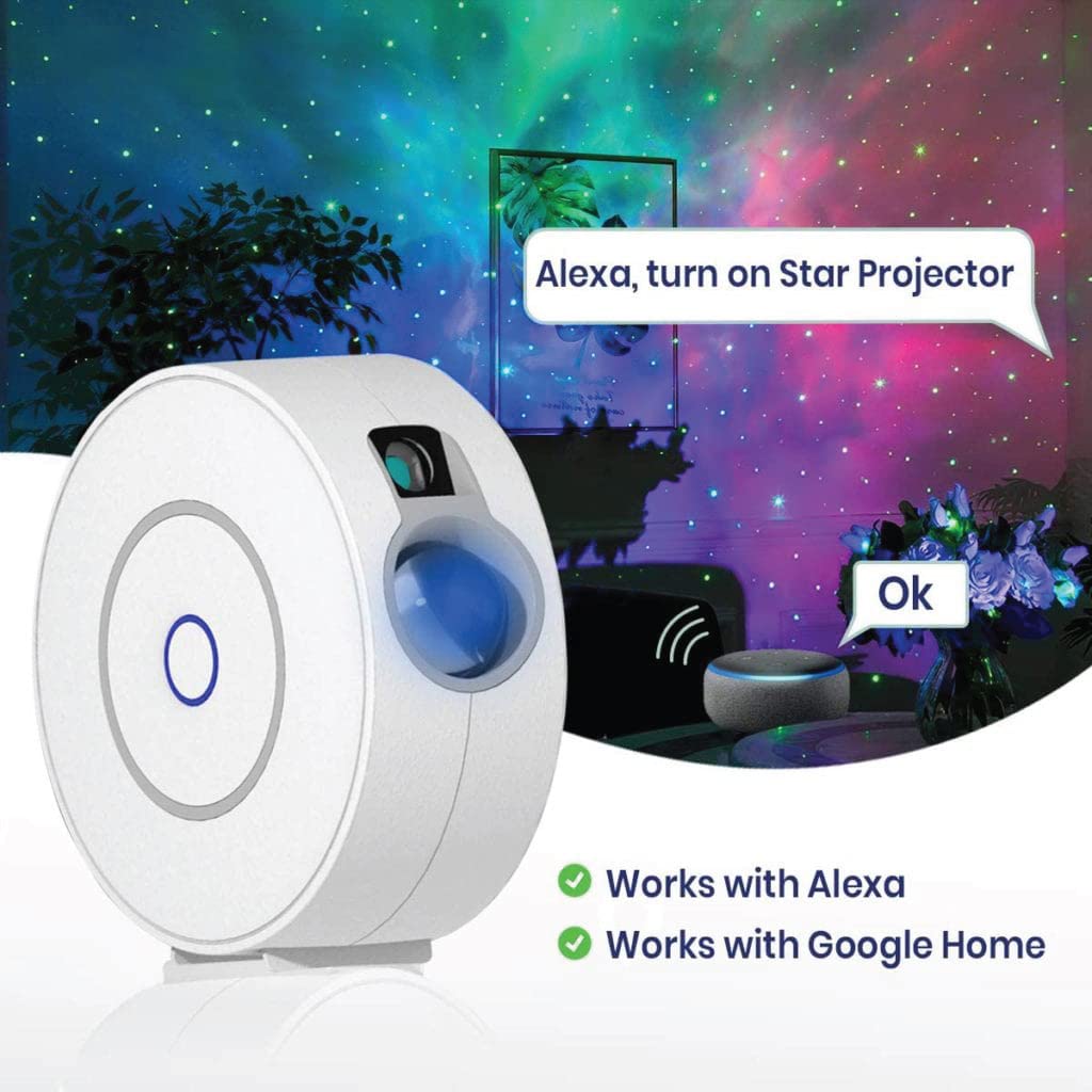 SMART WIFI STAR LIGHT PROJECTER: Проектор Star працює з додатком для телефону «Smart Life». Ви можете дистанційно керувати, щоб змінювати кольори, регулювати яскравість, встановлювати таймер і швидкість руху зірок, туманних хмар безпосередньо через телефон. Сумісний із Alexa Google Home за допомогою голосового керування.