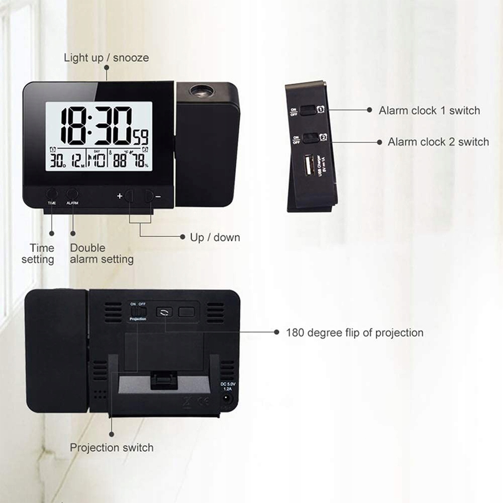 1. 180 Проекція часу\U0026 температури -160 Обертовий проектор може проектувати дуже чистий час і температуру на стіни або стелю; Багатокутне регулювання з кнопкою реверсу на 180 для будь-яких випадків. Щоразу, коли ви прокидаєтеся, перше, що з’являється у ваших очах, це час і температура.