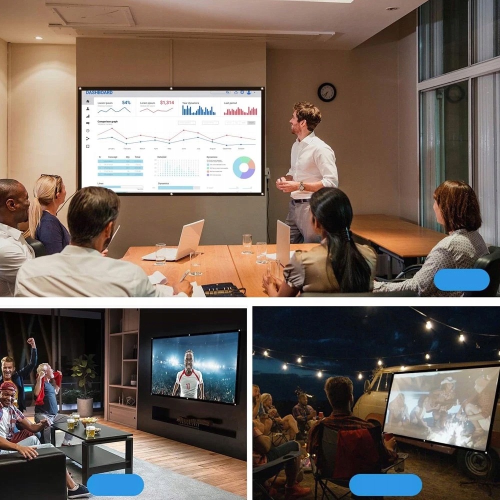 4. Універсальне використання: Цей проекційний екран, придатний як для домашнього, так і для офісного використання, є універсальним рішенням для різноманітних застосувань. Незалежно від того, чи потрібен він вам для професійних презентацій чи вечорів кіно з родиною та друзями, наш екран забезпечує плавне та захоплююче враження від перегляду.