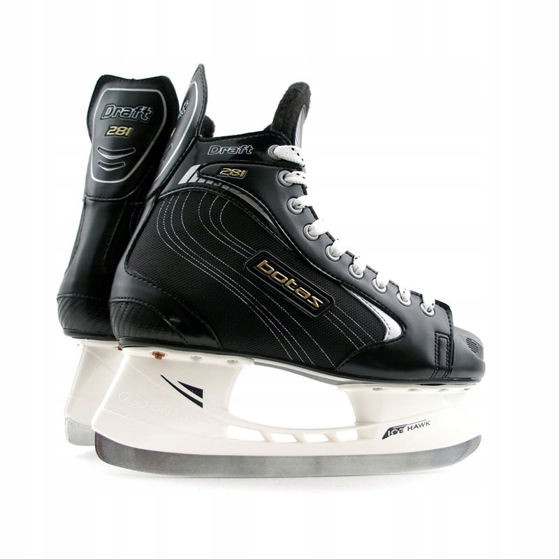 Нова модель хокейного набору 281 з привабливою конструкцією з комбінацією срібних та золотих прикрас на чорному тлі та срібних мереживах -кільця для початківців та звичайних фігуристів. Він оснащений захисними елементами ергономічного верхнього розрізу з бічним арматурою. Верх виготовлений з високоякісного чорного pa з динамічним друком срібла в поєднанні з міцним синтетичним матеріалом та посиленою частиною п’яти, що імітує вуглецевий матеріал. Нова анатомічна мова забезпечує краще відчуття під час катання. Пластиковий ніс TST (загальна технологія стабільності) надійно захищає пальці ніг під час ударів. Вставка складається з фетрового двоповерненого сендвіч. Подушка куба з двома різними жорсткістю - DDP та підкладкою з синтетичного велюру забезпечують загальну міцність та зміцнення взуття. У комплекті з чорною, низькопрофільною підошвою з більшою жорсткістю крутіння та ковзанами для льоду Botas Icehawk Carbon Ultra Steel в білому з високоякісними закріпленнями в п’яті.