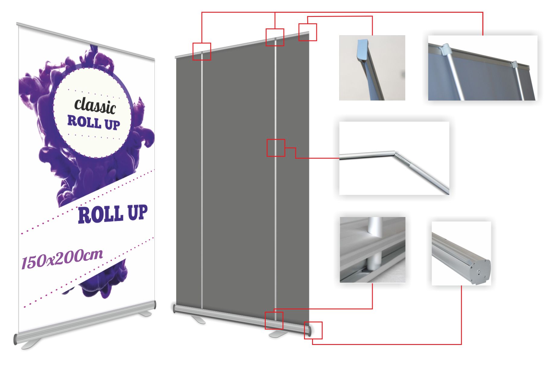 Рол-ап складається з алюмінієвої касети та рамки з прикріпленою графікою. Це легка та проста конструкція, яка дозволяє легко та швидко збирати та розбирати (графіка розгортається та ховається в касеті).