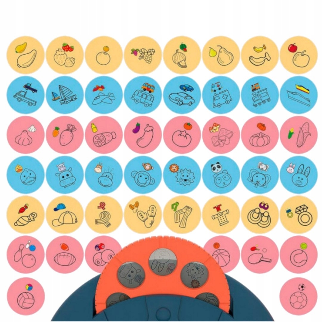 6 дисків із тематичними візерунками, що навчають дітей форм, кольорів та назв овочів, фруктів, транспорту, спортивних предметів, елементів одягу та морд тварин.
