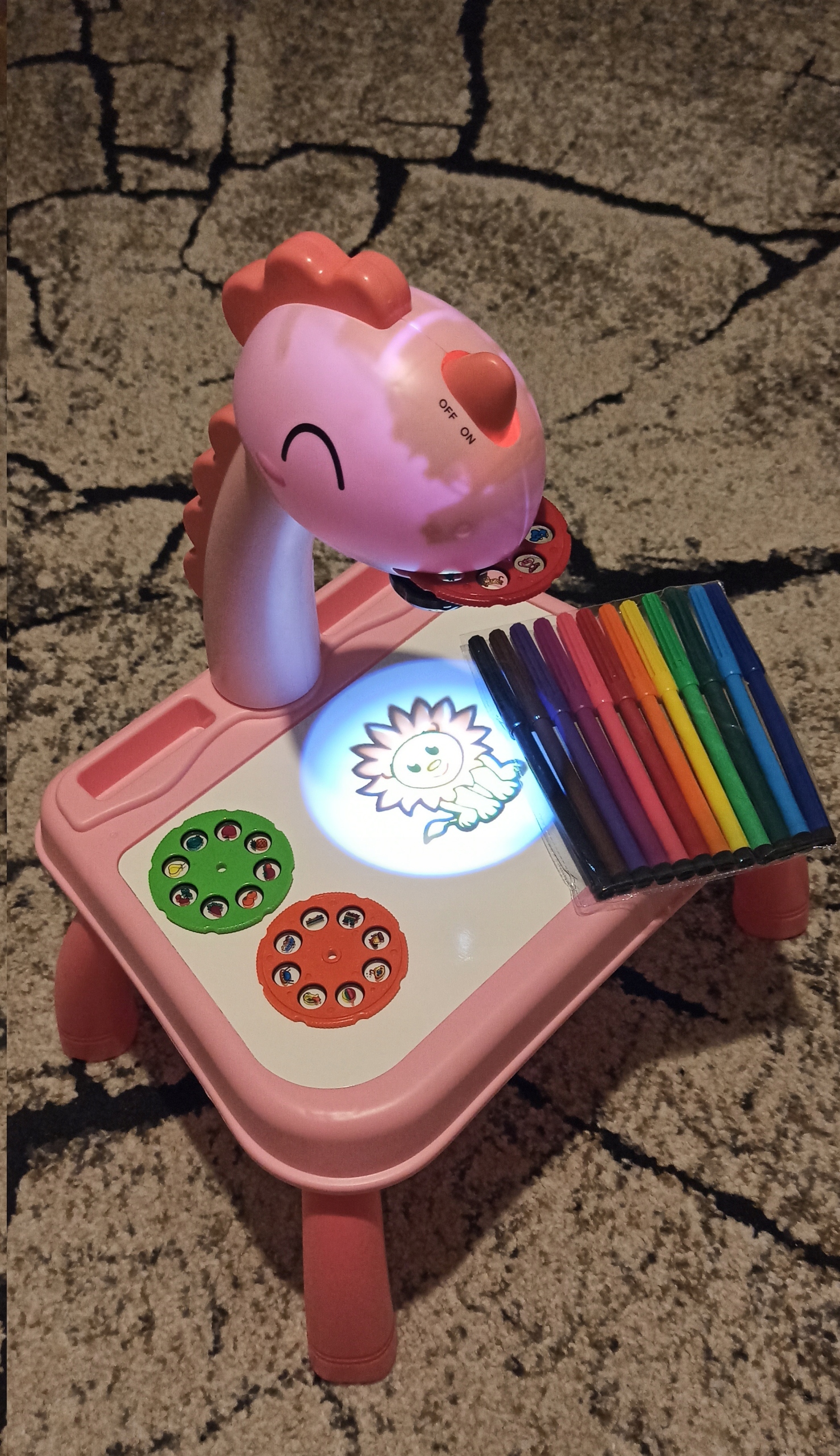 Проектор має знімні ніжки, тому ви можете нахилити його або поставити на стіл. З проектором малювати стає набагато веселіше! Просто вставте диск у гніздо проектора та натисніть кнопку, щоб увімкнути проектор.