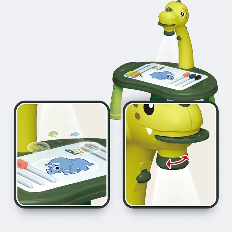 Проектор для малювання у формі динозавра є ідеальним інструментом для розвитку творчих здібностей у наймолодших. Завдяки вбудованому проектору діти можуть приносити свої втілювати ідеї в життя, малюючи малюнки на спеціальних картках або безпосередньо на поверхні столу.