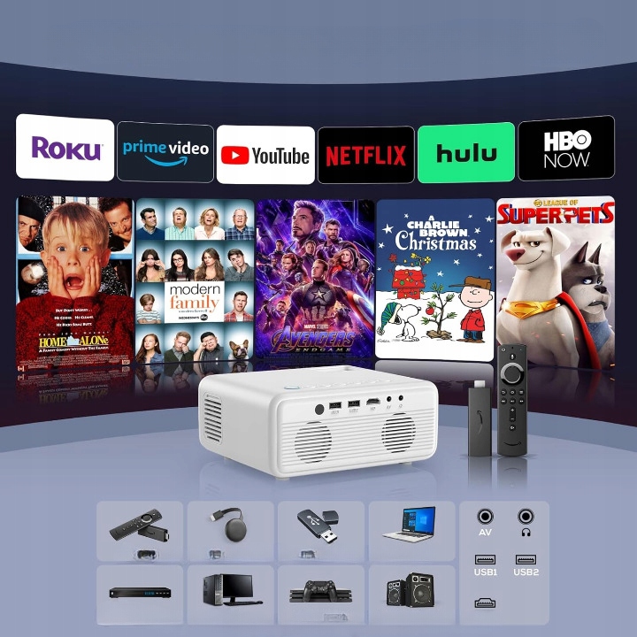 Проектор iZEEKER WiFi оснащено портом HDMI, USB*2 і AV, що дозволяє легко підключати його до телевізорів, телефонів FireStick, iOS і Android, ноутбуків, USB-накопичувачів, навушників і DVD-плеєрів тощо. у передовій системі охолодження ефективно зменшує шум вентилятора проектора, забезпечуючи відчуття занурення в кіно.