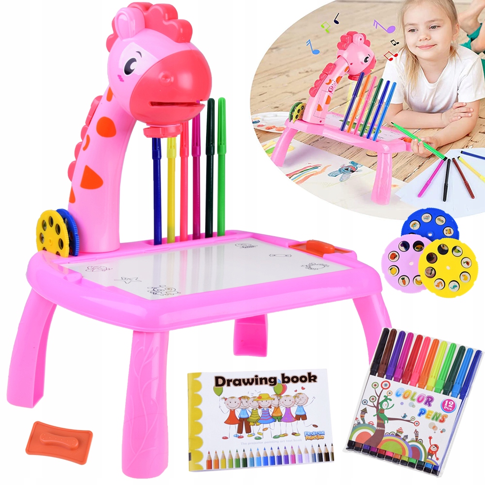 Жираф-проектор - це чарівний ігровий набір для кожної дитини, яка любить творити мистецтво, малювати, малювати, розглядати картинки та створювати власні унікальні історії та казки. Проектор жирафа має стільницю, на якій дитина зможе розкладати фломастери, малювати та копіювати зображення, що відображаються на проекторі. Стільницю можна розташувати рівно на вашому столі чи столі, або ви можете прикріпити чотири ніжки, щоб створити невеликий стіл. Проектор можна використовувати в широкому діапазоні застосувань - ви можете відображати зображення (тварини, транспортні засоби, фрукти) на аркуші паперу, на столі або навіть на стіні ввечері. Проектор дуже гарно зроблений, грати з ним буде дуже весело.
