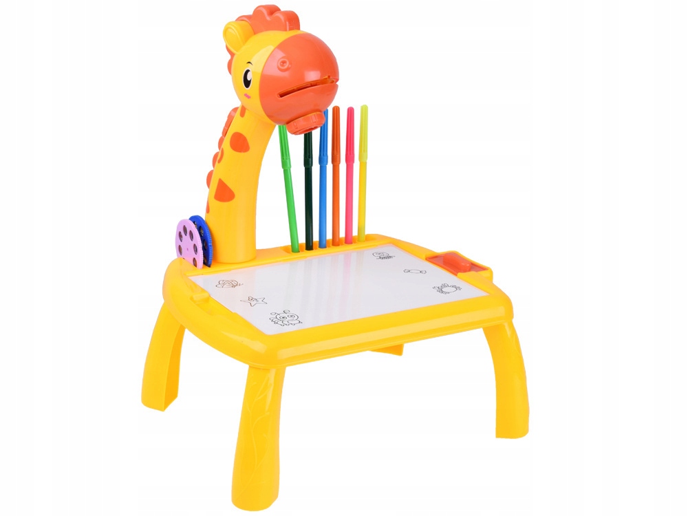 - Проектор «Жираф» — ідеальний набір для маленьких художників, які люблять малювати. Завдяки шиї-жирафу проектора діти можуть проектувати зображення на аркуш паперу, стіл або стіну. У набір входить 12 фломастерів, 3 набори викрійок, зошит для малювання, блокнот, парта з полицями, губка і полиці для аксесуарів. Діти можуть створювати власні історії на основі зображень тварин, транспортних засобів і фруктів. Працює проектор від батарейок АА, які входять в комплект. Це ідеальна іграшка, яка розвиває уяву та творчі здібності, упакована в барвисту коробку, ідеальна як подарунок. Відкрийте для себе світ творчих розваг із проектором Giraffe від Jokomisiada!
