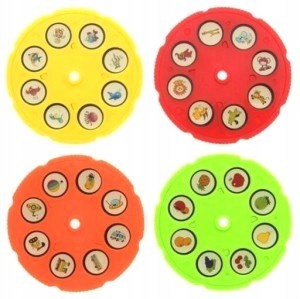 - Проектор має 4 диски з тематичними малюнками, завдяки яким дитина вивчає форми, кольори та назви тварин, транспортних засобів і фруктів.