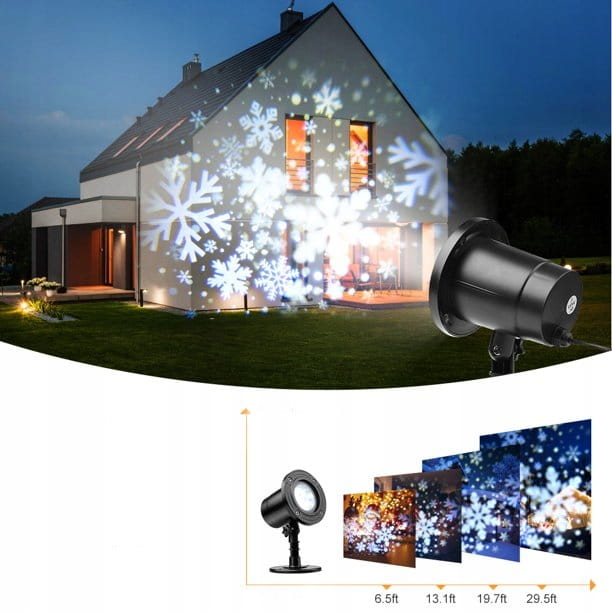 Різдвяний світлодіодний проектор – це ідеальний пристрій, який освітить ваш дім/квартиру та зробить його неповторним. Він відображатиме сніжинки як на будівлі, так і на будинку, наприклад, у кімнаті. Це, безумовно, найпростіший і найшвидший спосіб прикрасити на Різдво. Просто розмістіть його перед проекційною поверхнею та насолоджуйтесь унікальним графічним дизайном.