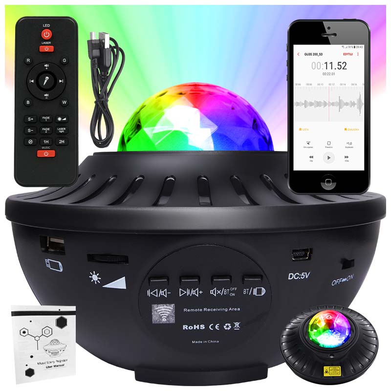 K791 до геніальний проектор зірок і нічного неба з дистанційним керуванням із вбудованим динаміком Bluetooth, портом USB b> і MP3-плеєр, що дозволяє відтворювати музику, серед іншого з нашого телефону, смартфона або флока, який ідеально підходить для дитячих ігор, як нічник під час засинання на вечір або ідея подарунка. K791 також чудовий вибір для створення цікавого настрою в кімнатах під час різноманітних заходів .