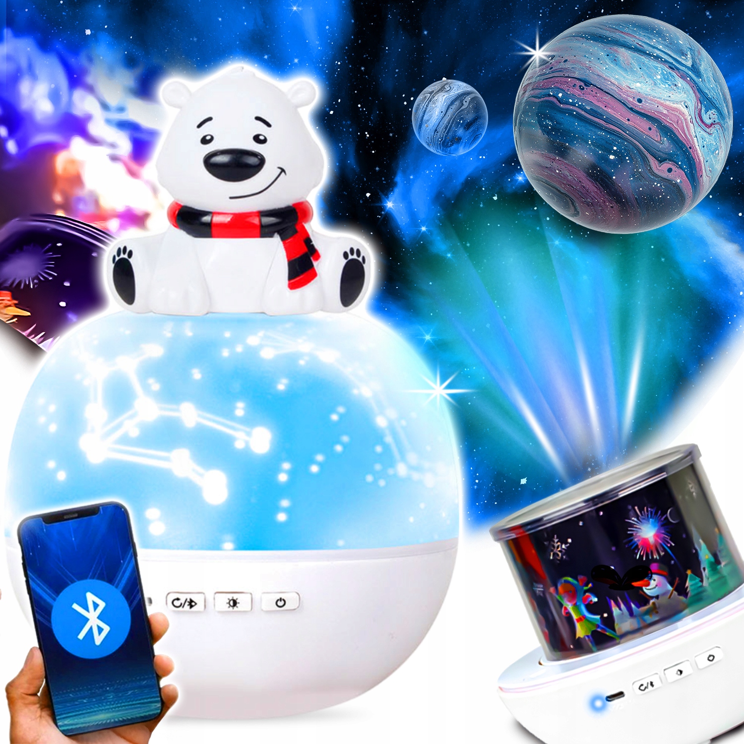 - Цей чарівний гаджет, окрім функціональності проектування космічних небесних тіл, вирізняється своєю казковою формою – білим ведмедиком, який неодмінно стане найкращим другом вашої дитини.