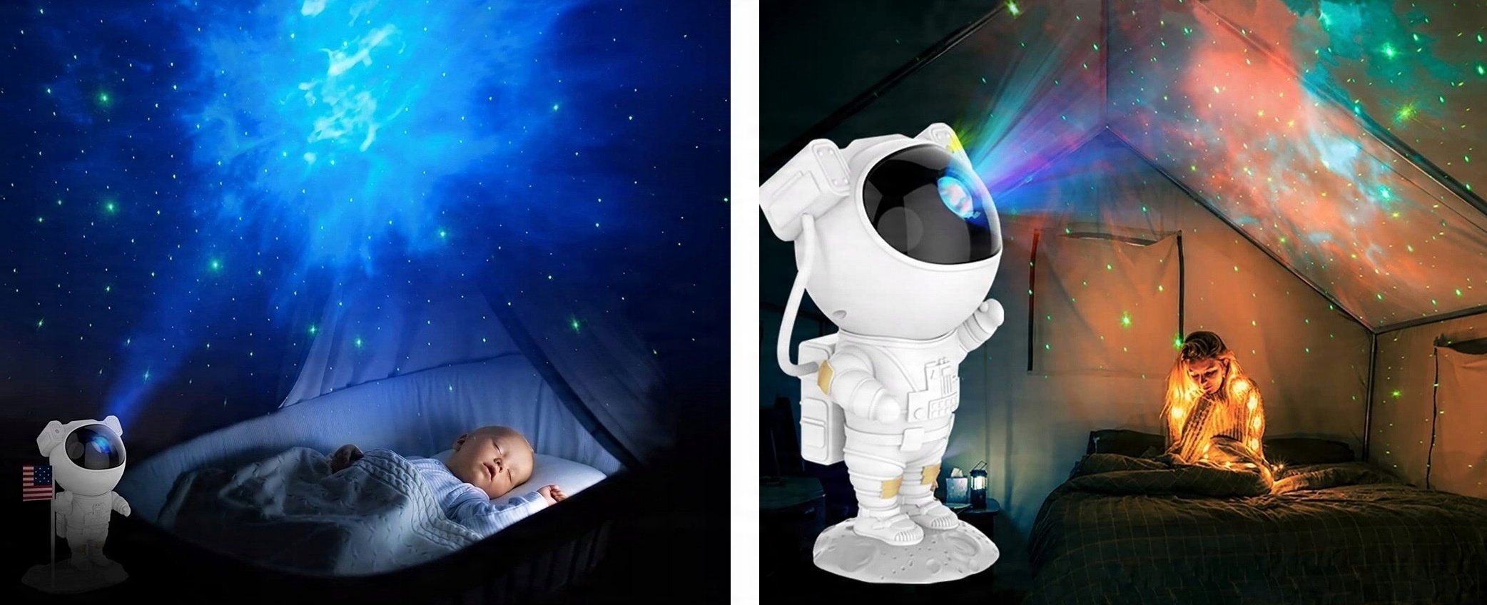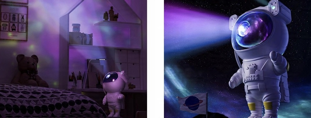 Багатофункціональний проектор виконує функцію лампи та проектора. Проектор астронавта використовує синій, червоний, зелений і білий кольори для створення красивої проекції. Світло падає на стелю та стіни кімнати, створюючи реалістичне зоряне нічне небо, створюючи розслаблюючу та атмосферну атмосферу та викликаючи бажання прогулятися серед зірок. Гаджет стимулює дитячу уяву та допомагає швидко та спокійно заснути.