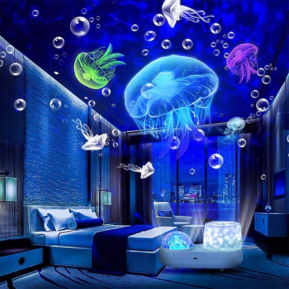 Нічник із проектором океанських хвиль має 6 видів шаблонів проекції атмосфери, включаючи тему медузи, тему дня народження, тему дельфіна, тему риби-клоуна, тему зоряного неба, тему феї оленя тема. Дитячий нічний проектор також служить нічником для дитячої кімнати, надаючи спальні атмосферу, повну тематичних візерунків, корисних для дитячого сну.