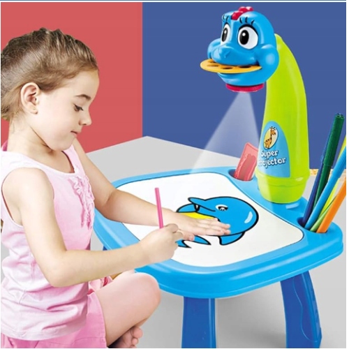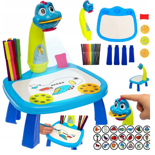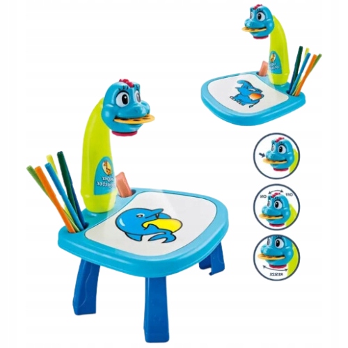 Спеціальний проектор у формі голови динозавра виводить на дошку малюнки, які діти малюють фломастерами, що додаються. Стіл з проектором - чудова іграшкаі класний гаджет для всіх дітей, які люблять малювати. Гра дуже проста: прикріпіть ніжки до дошки, а посередині помістіть проектор із головою динозавра. Вставте одне зі слайдів у голову динозавра. Увімкніть проектор, пересунувши перемикач, розташований у верхній частині. Проектор відобразить зображення на слайді на дошці.