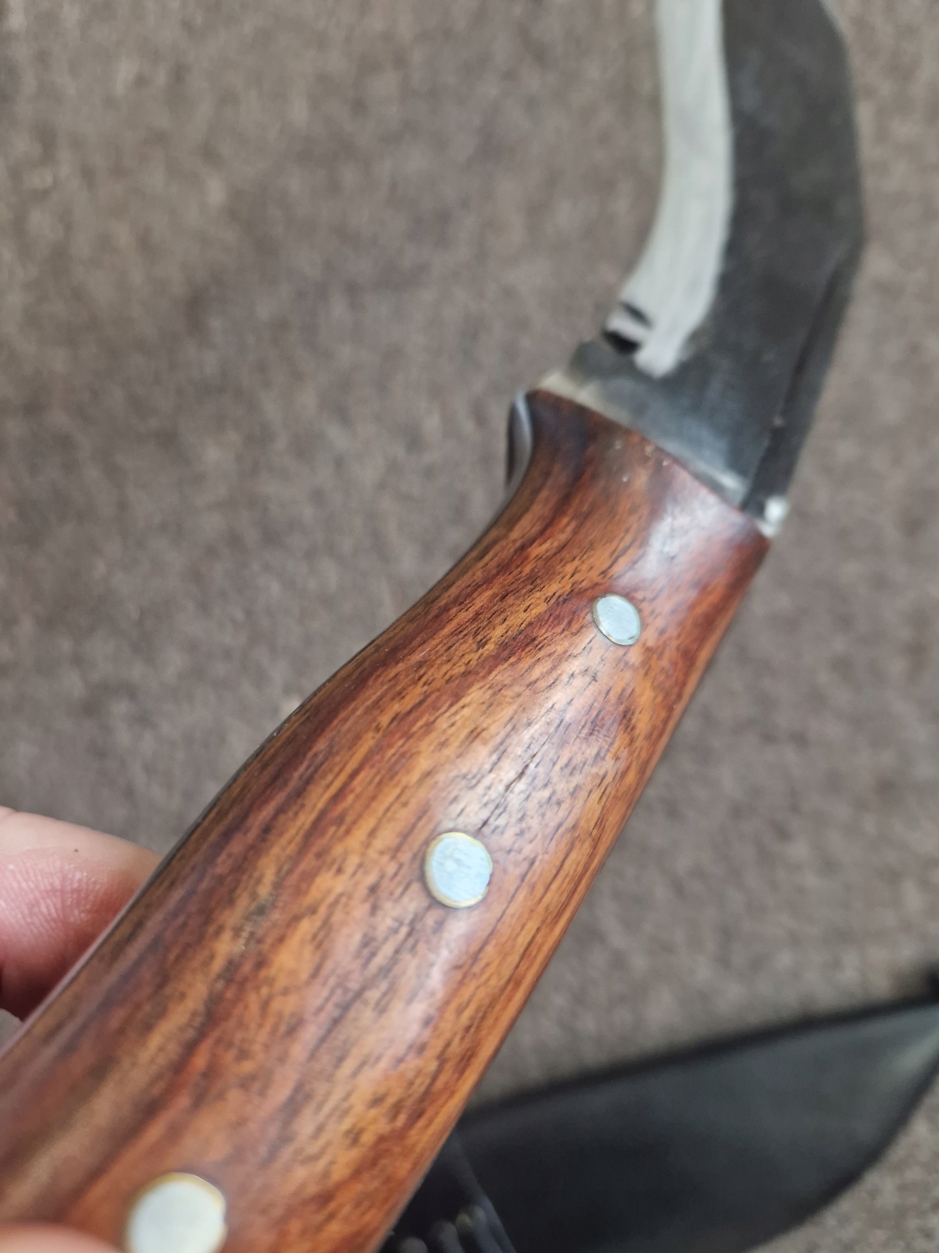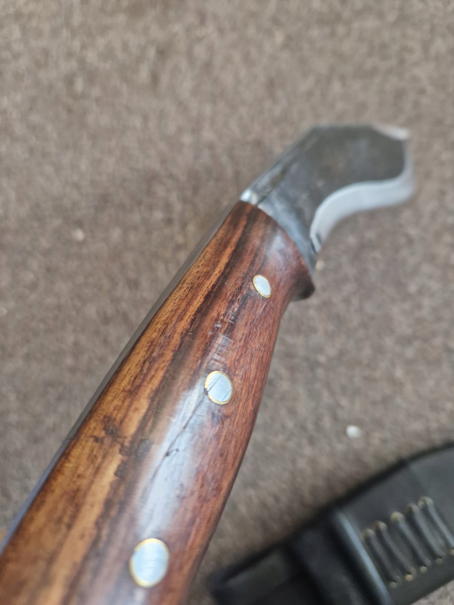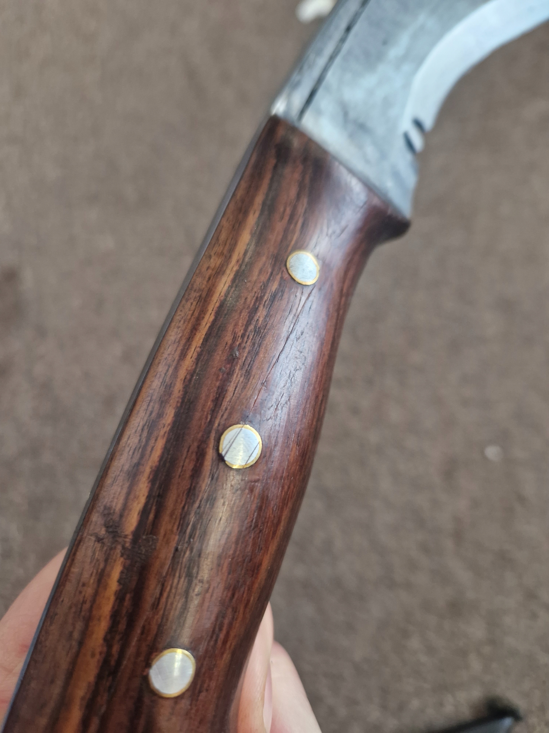 Рукоятка з палісандровою обшивкою, посилена заклепками, склеєна традиційним непальським клеєм Laha