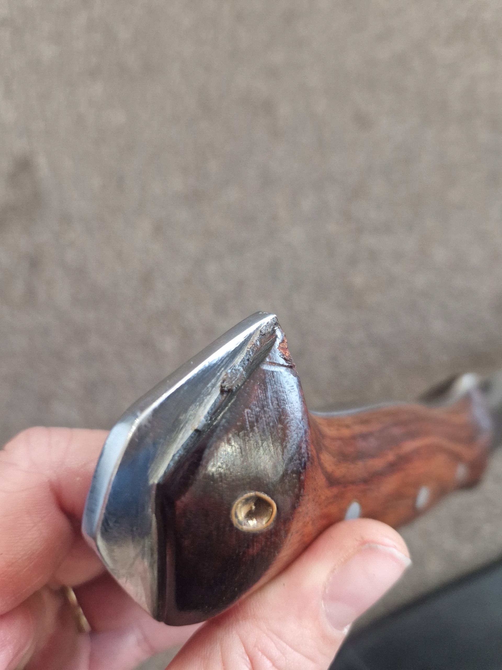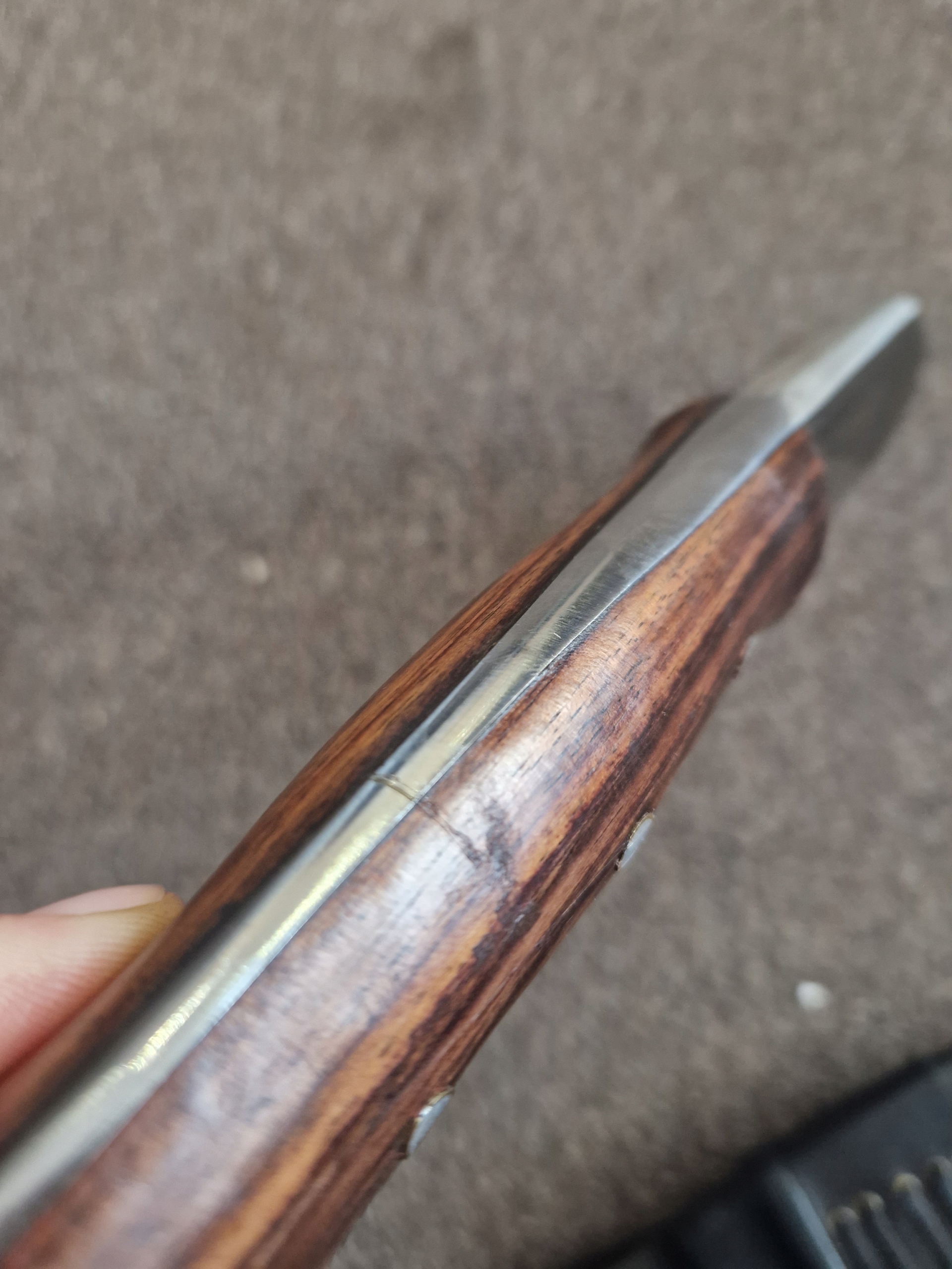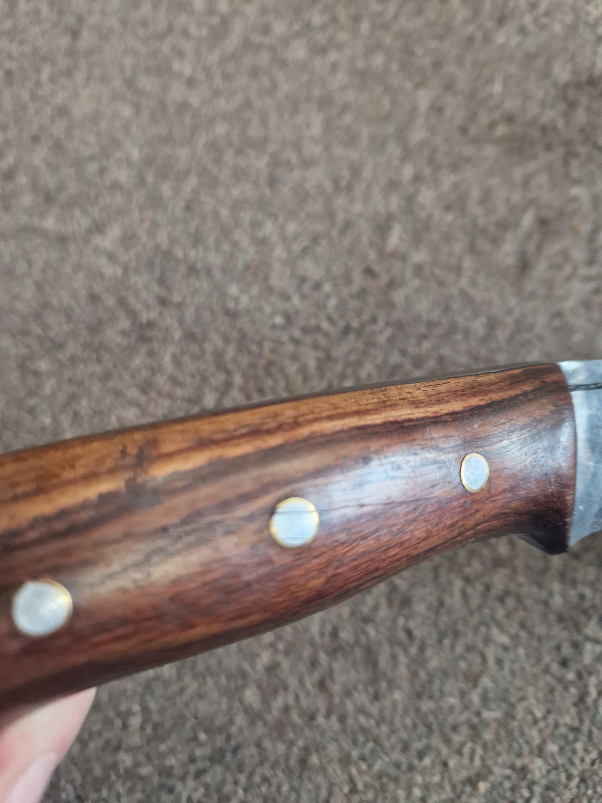 Рукоятка з палісандровою обшивкою, посилена заклепками, склеєна традиційним непальським клеєм Laha