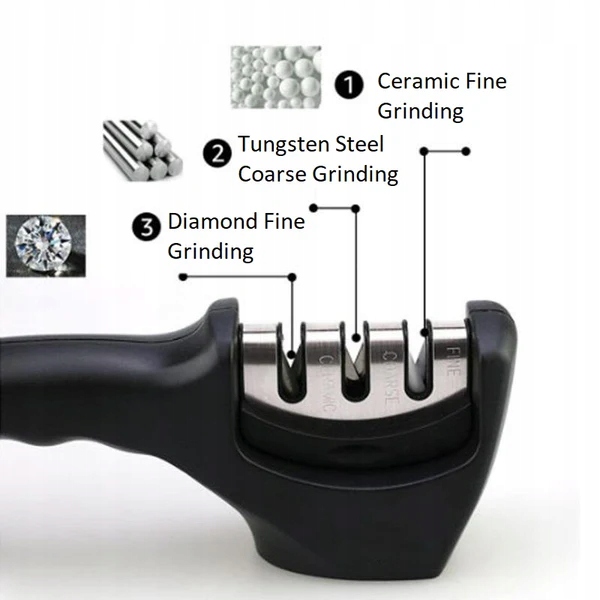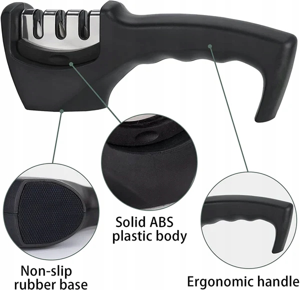 Ми революціонуємо мистецтво заточкових ножів! Наш 3-крок точильника ножа-це швидкий та ефективний інструмент, який відновлює точність та різкість ваших кухонних ножів. Завдяки трьох різних слотів - Діаманту, Вольфраму та керамічній сталі - за мить ока, ви можете поновити як старі, так і нові леза, отримуючи ідеально гострі ножі лише за кілька рухів. 4 > 4 - Ергономічна ручка забезпечує комфорт та безпеку під час заточення. Незалежно від того, ви праві чи ліва, просто покладіть лезо в праву проміжок і обережно перетягніть ніж, щоб отримати швидке та ефективне заточення. Відповідність гумової основи забезпечує максимальну стабільність, а довга ручка тримає руку подалі від леза, що мінімізує ризик скорочення. Інші кухонні ножі, що робить його універсальним інструментом на кожній кухні. використання.