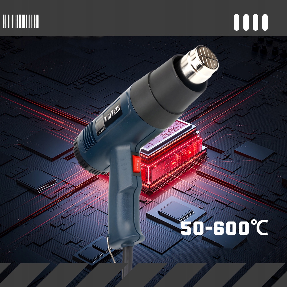 пістолет з гарячим повітрям пропонує різні налаштування температури. Він використовує два високотемпературні нагрівальні кабелі, які накопичують тепло швидше і нагріваються швидше. Він оснащений захистом від перевантаження з контролем температури і має тривалий термін експлуатації.