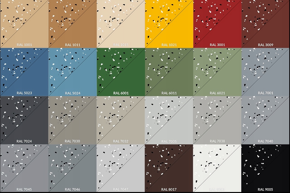 Для світлих кольорів RAL 1001, 1021, 7032, 7035, 7047, 9003, 1021 рекомендується мати щонайменше фарбування три рази для отримання більш непрозорого покриття.
