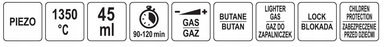 Газовий пальник з п'єзорозпалом, працює від запальнички. Має регулювання потужності полум'я, алюмінієвий корпус з нековзкою поверхнею. Пальник дозволяє досягти температури 1350°C.