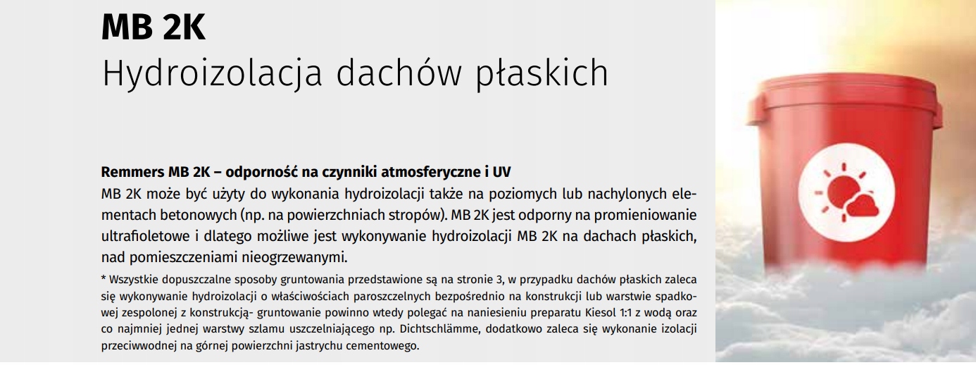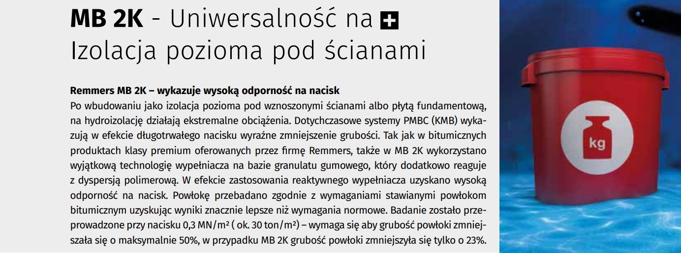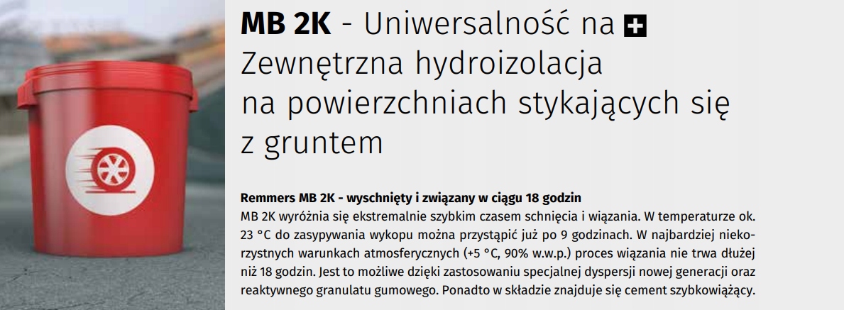 MB 2K — це інноваційний гідроізоляційний продукт, який поєднує в собі властивості гнучкої герметизуючої суміші, що не містить розчинників, і густої -шарове бітумне покриття. MB 2K – двокомпонентна реактивна маса нового покоління для швидкої герметизації елементів будівель і конструкцій.