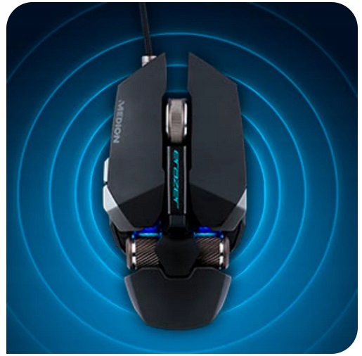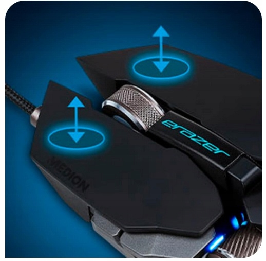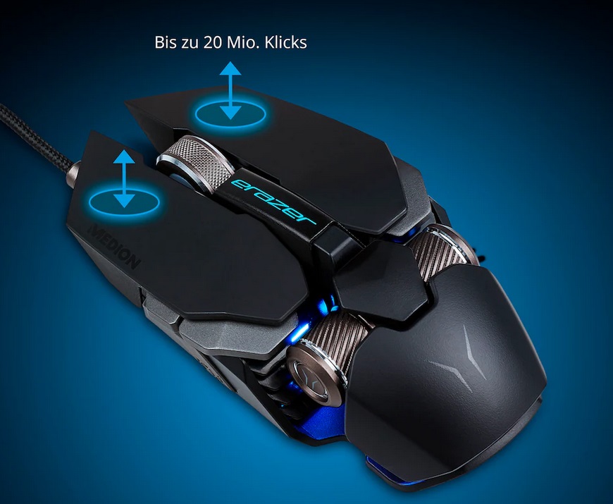 MEDION ERAZER X81666 також грає довго! Високопродуктивні кнопки миші OMRON витримують до 20 мільйонів натискань, а завдяки особливому ергономічному дизайну ігрової миші ви не задихаєтеся так швидко. Це саме та ігрова продуктивність, яка вам потрібна. І це виглядає справді елегантно завдяки стильному освітленню RGB.