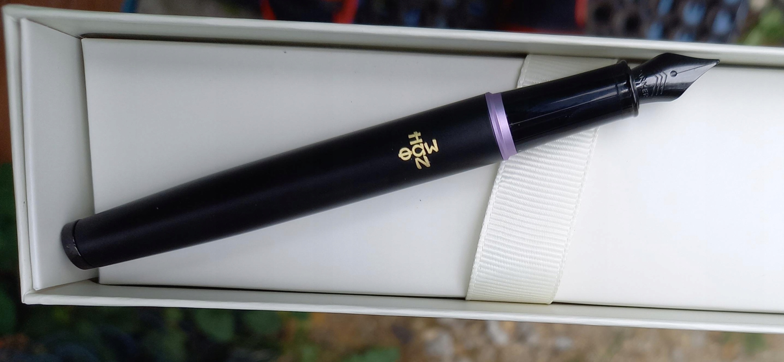 Характерна кліпса у формі стріли вкрита чорним PVD-покриттям - технологічно передовий метод, який забезпечує неперевершену стійкість до зношування та корозії, що водночас підкреслює ахроматичність естетичність пера. Характерне фіолетове кільце. Лицьова частина виконана з лакованого ABS-пластику.
