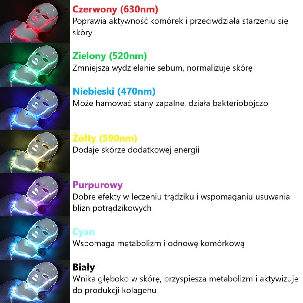 Червоне світло - стимулює шкіру до збільшення виробництва колагену та еластину, що допомагає зменшити зморшки та підвищити пружність шкіри. Має протизапальні властивості та зменшує почервоніння.