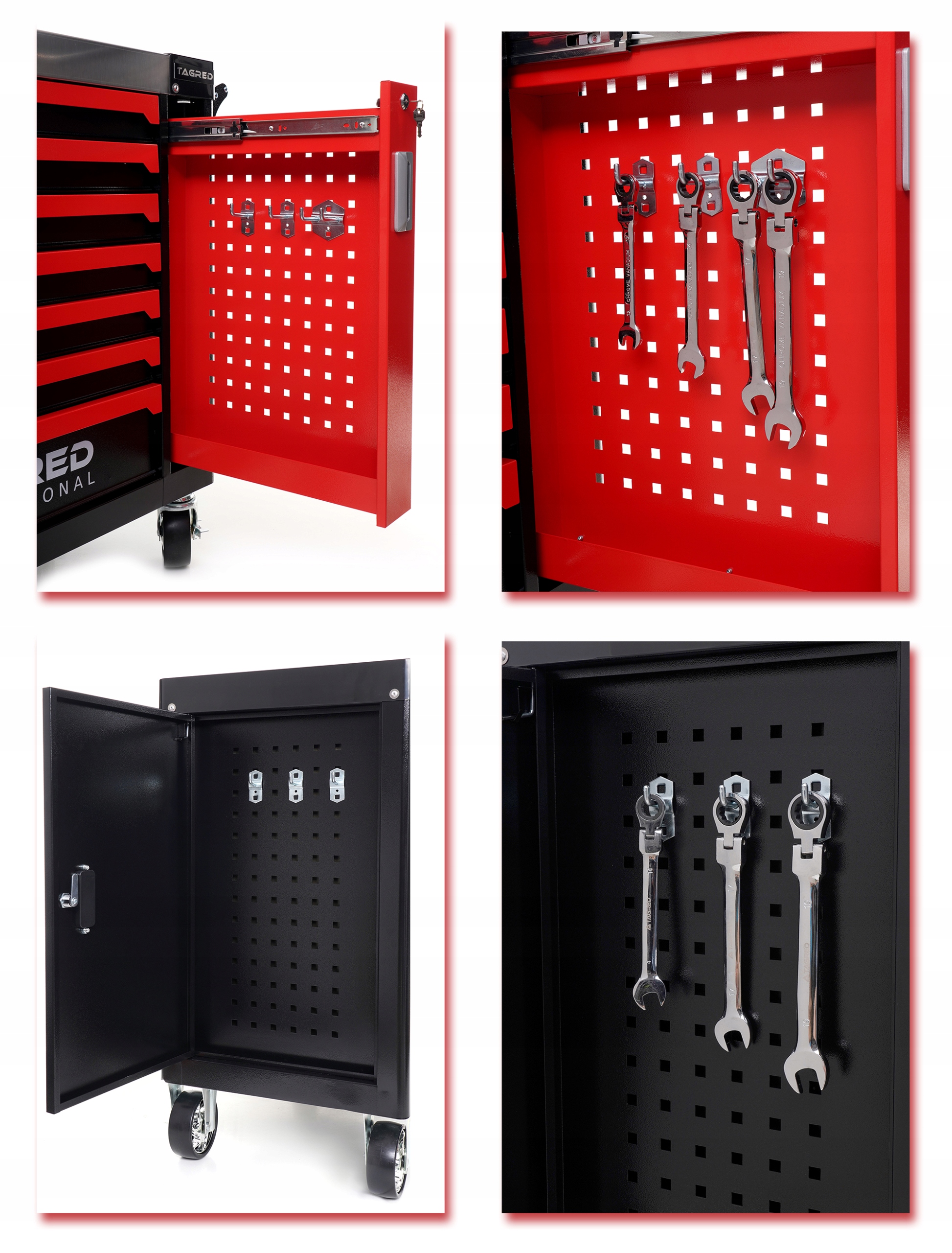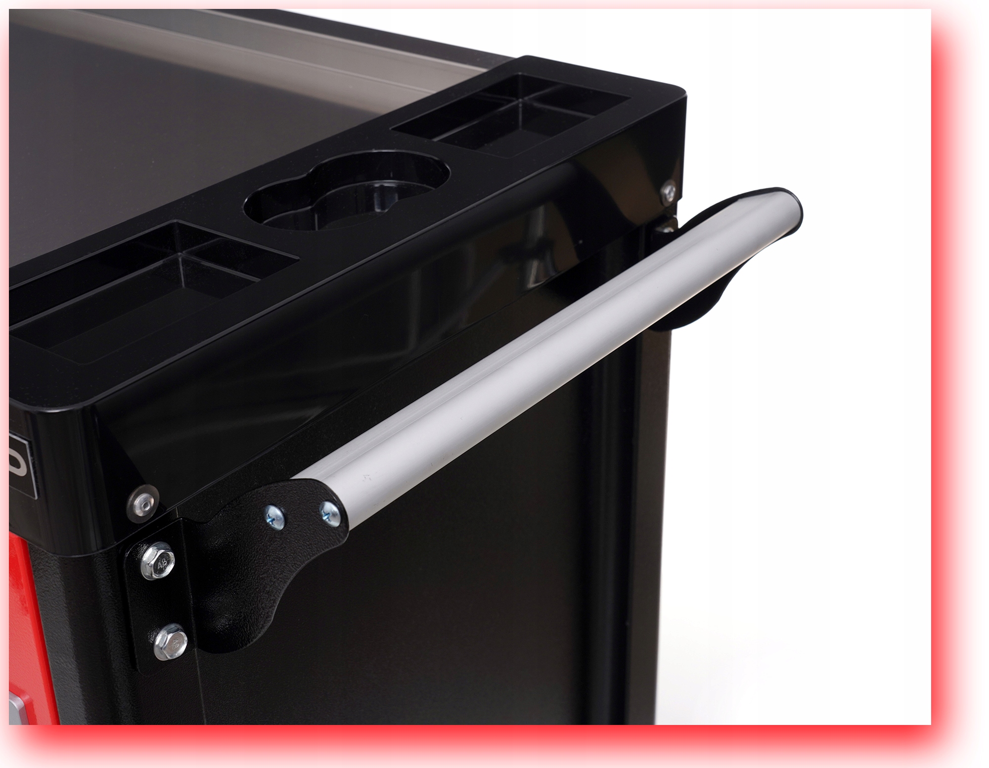 Додаткові зручності: У конструкції враховано практичні деталі, такі як можливість встановлення лещата або додаткові тримачі для рушників або хімікатів. Підкладка шухляд EVA підвищує довговічність і захист інструментів.