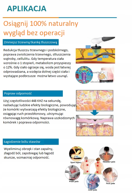 Використання високої частоти 448 кГц для проникнення в тіло, глибоке нагрівання тіла, завдяки якому високотемпературній енергії проникає в шар жиру, шар фасції і навіть порожнечу жиру в глибокій частині людського тіла і генерує тепло безболісно. Температура тіла і зберігайте його протягом 6-8 годин, активуйте різні функціональні дії людського організму, зменшують підшкірний жир, суєтну жир та покращують здоров'я.