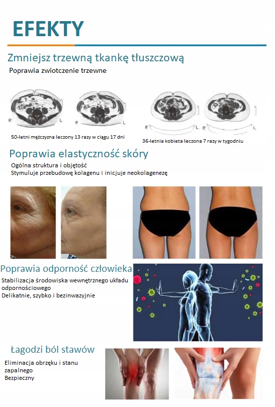 його глибокий ефект мобілізує іони та забезпечує енергію внутрішніх приміщеннях тіла. Оптимізує іонну заміну для збалансування електричного потенціалу в тканині. Це дає нове життя шкіри в твердій та забарвленні. Утворюється неоколаген. Адипоцити вивільняють жир, завдяки якому організм вирізаний. Мікроциркуляція та гіпертермія прискорюють регенеративні процеси цільових тканин.
