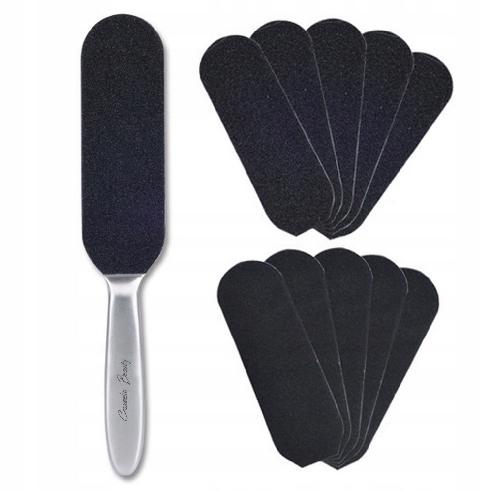 У комплекті з металевою теркою є змінні знімачі різної зернистості: 5 штук із зернистістю 100 для видалення ороговілої шкіри та мозолів і 5 шт. шматки із зернистістю 180 для остаточного вирівнювання та згладжування.