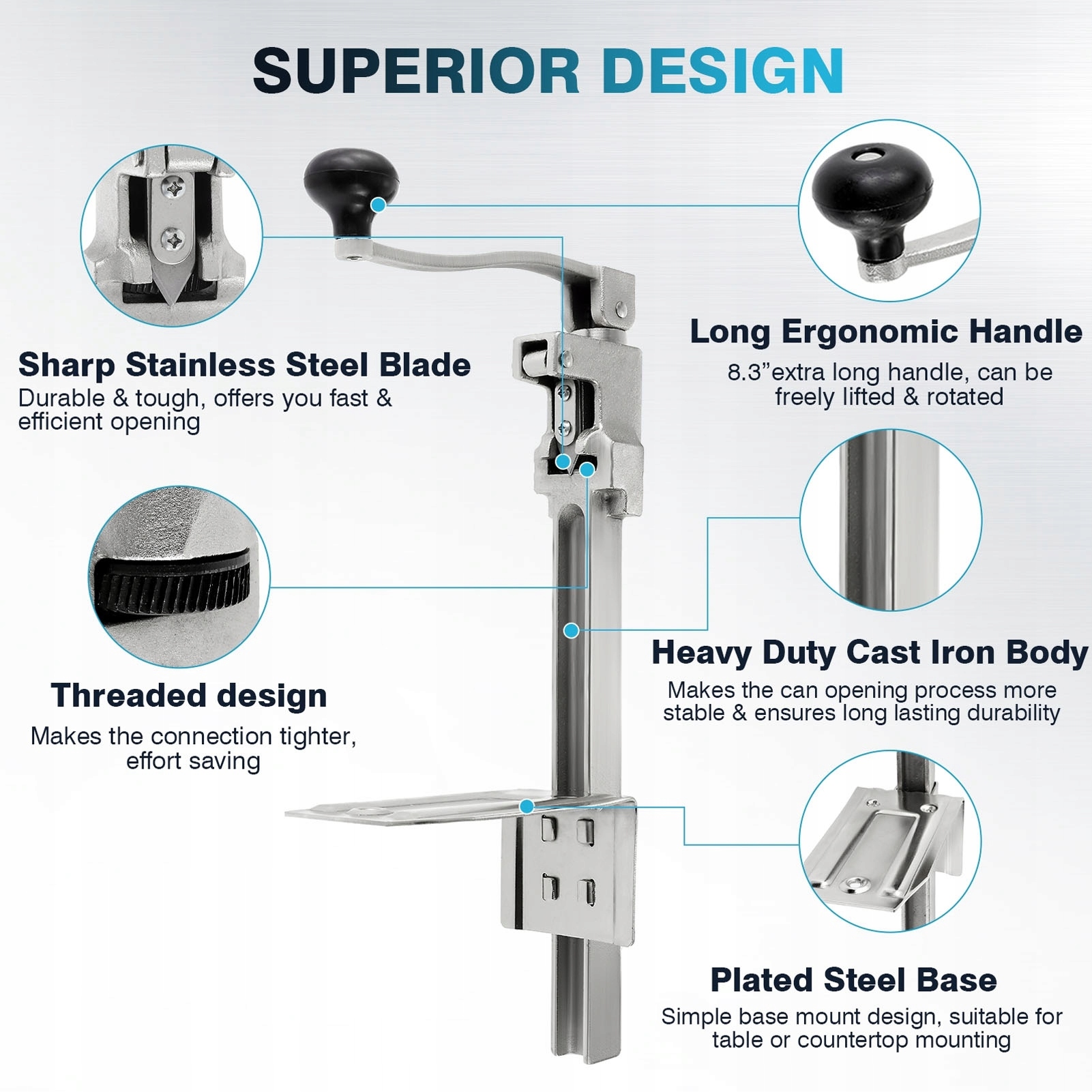 1. Основа з оцинкованої сталі: міцна основа цього консервного ножа легко кріпиться на будь-яку стільницю.