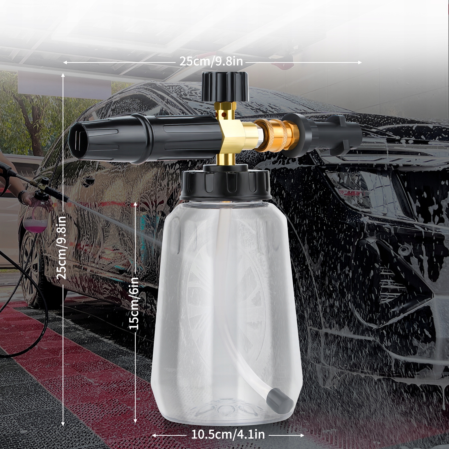 Флакон з піною можна використовувати для всіх транспортних засобів, автомобілів, мотоциклів, вантажівок, позашляховиків, підлоги, вікон, під’їздів тощо. Сумісний із з’єднанням для мийки високого тиску 1/4 дюйма, діапазон робочого тиску 1500-3600 PSI. Це також ідеальний вибір для економії часу та ідеальний подарунок для вашої родини чи друзів. Ємність 1 літр дозволяє помити 2-3 автомобіля