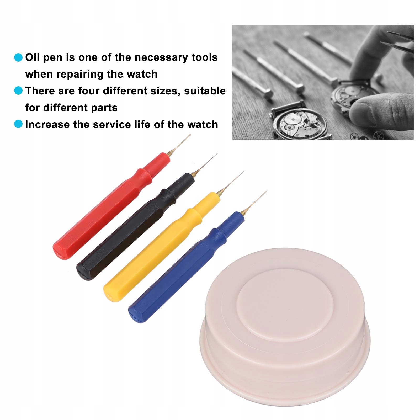 4. Масляна ручка є одним з необхідних інструментів при ремонті годинника. Є чотири різних розміри, які підходять для різних частин і збільшують термін служби годинника.