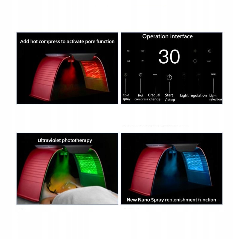 Відкрийте технологію передової шкіри з професійною світлодіодною лампою для легкої терапії. Пристрій поєднує фототерапію, нано -туман, забезпечуючи комплексне догляд за шкірою в домашніх умовах та професійних умовах.