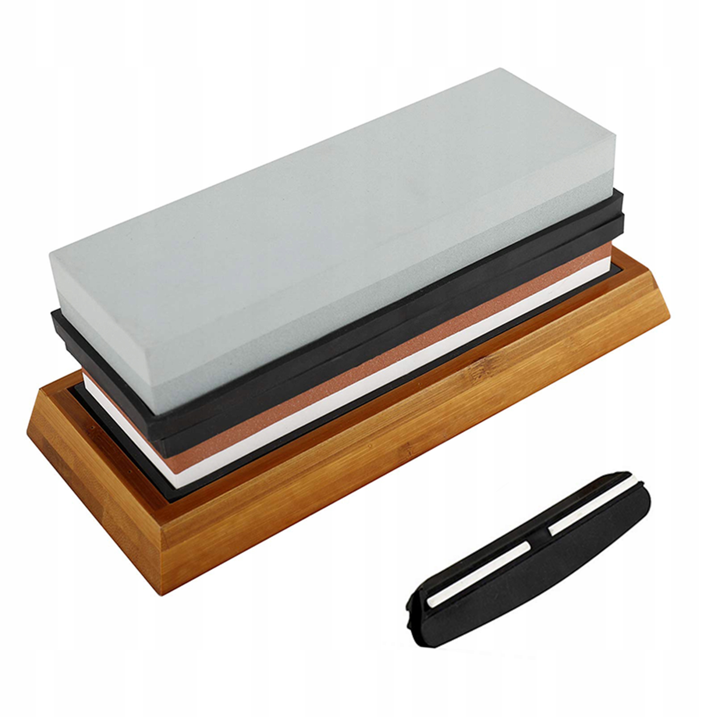 Набір виготовлено з твердих матеріалів - точильні камені з білого корунду забезпечують рівномірне стирання без ризику перегріву леза. Бамбукова підставка з гумовою вставкою запобігає його зміщенню під час заточування, забезпечуючи повний контроль.