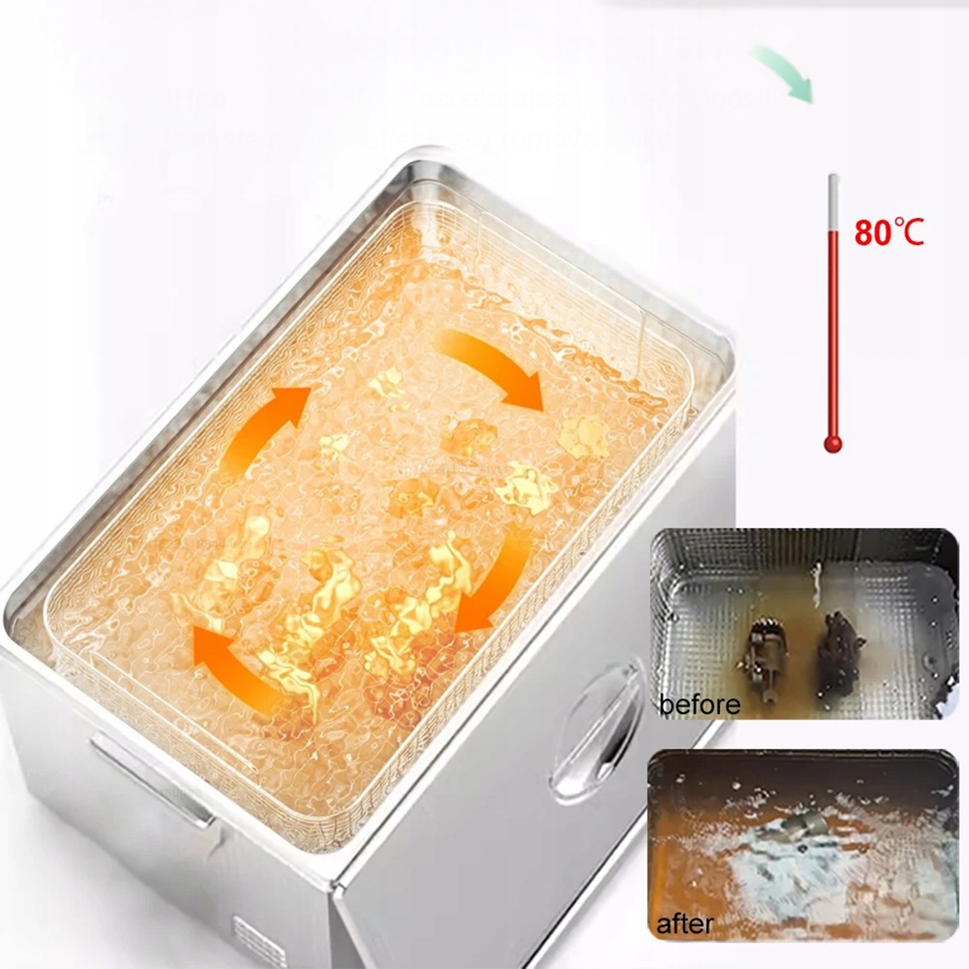 Час регулюється від 0 до 30 хвилин, а температуру можна встановити в RT-176 ℉/RT-80 ℃, відображеному на світлодіодних екранах. Функція нагріву значно покращує ефективність очищення. Ультразвукове очищення та опалення можуть працювати одночасно.