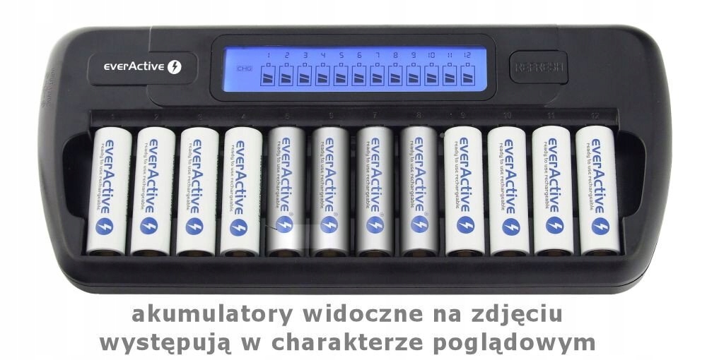 Eveactive NC 1200 зарядний пристрій має 12 незалежні зарядки зарядки до ni-mh у розмірах r6/aa або r03/aaa , кожне посилання завантажується індивідуально. Це нове на польському ринку, використовуючи найсучаснішу технологію.