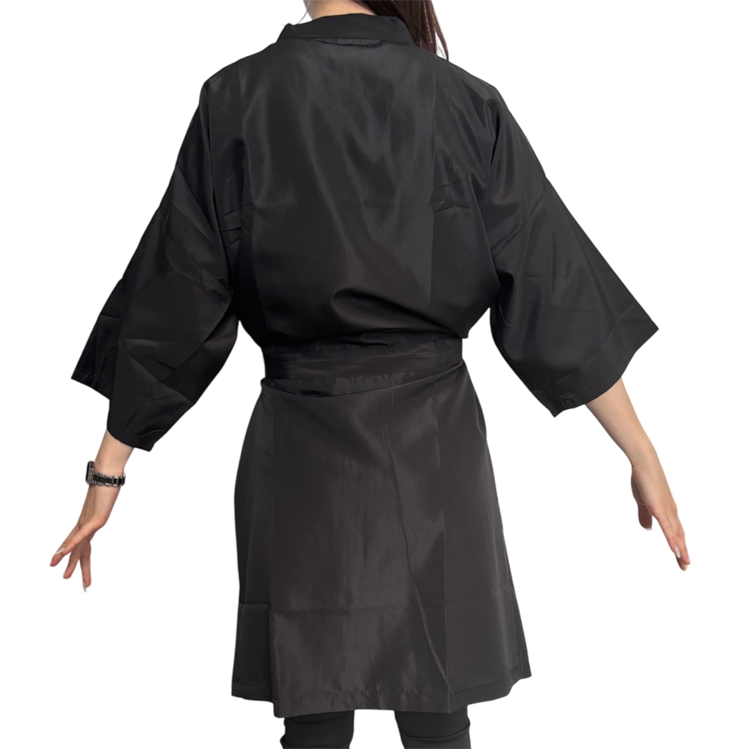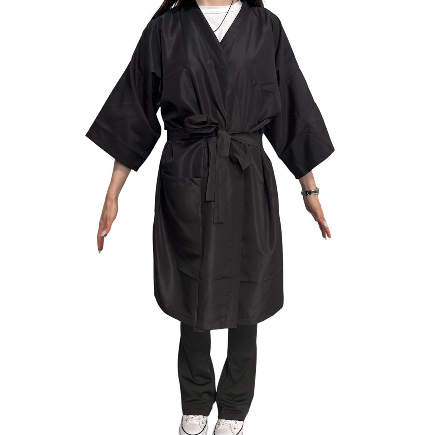 Професійна перукарня кімоно, виготовлена з легкого та стійкого до бруду матеріалу. Він захищає клієнтський одяг від волосся, фарби, води та інших домішок під час перукаря. Завдяки поясу він добре адаптується до фігури.