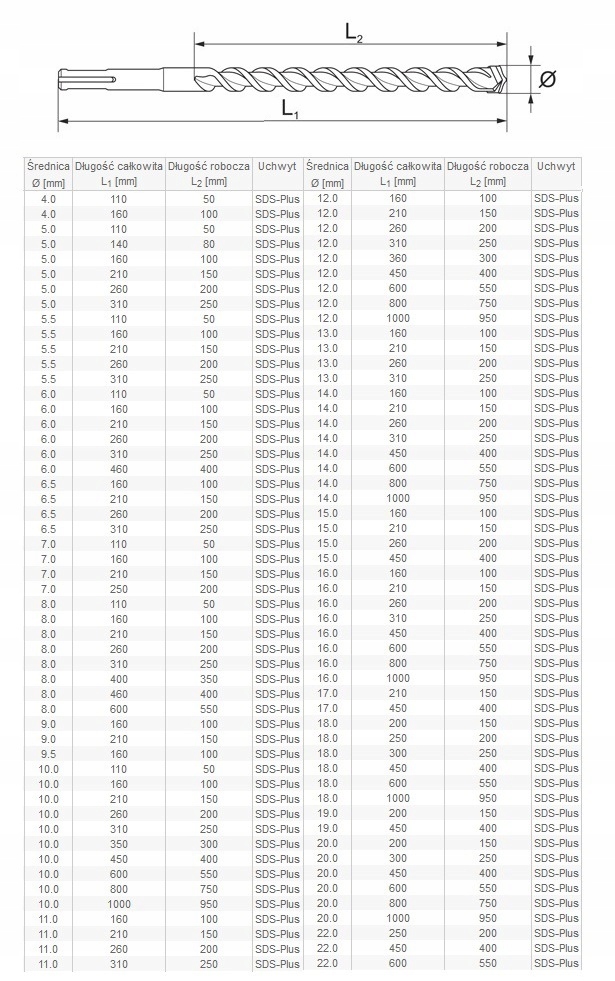 Професійні ударні дрилі з популярним тримачем SDS-Plus. Одинарна пластина Widia з центруючою точкою і трьома асиметричними виступами, що подрібнюють підкладку.Свердло рекомендовано для використання з ударними дрилями вагою від 2 кг до 4 кг.