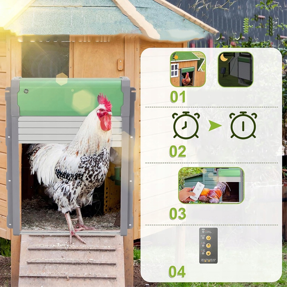 Виберіть один із 4 режимів роботи: ручний, дистанційне керування, датчик світла або таймер! Ідеально підходить до щоденного ритму ваших курей.